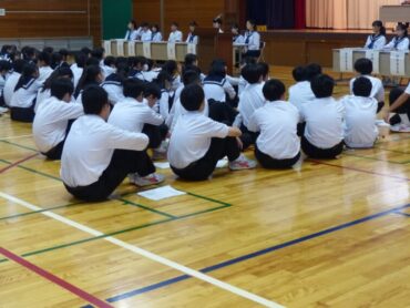 2025.10.21 全校生 生徒総会 生徒総会で、前期生徒会活動報告と後期生徒会活動計画案の説明がありました。後期生徒会執行部の活動目標は、「縦のつながり、横のつながりを大切にし、学校全体をNEXT STAGEにつなげよう」です。