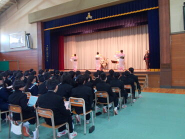 高岡市音楽科生徒対象事業として、民謡・民舞鑑賞がありました。「こきりこ節」では、生徒代表がささらにふれる体験もありました。「美しい音色で何度もききたくなりました」「優雅な踊りでゆったりとした気持ちになりました」「こきりこ節をみんなでうたった体験が楽しかったです」等の感想をもっていました。